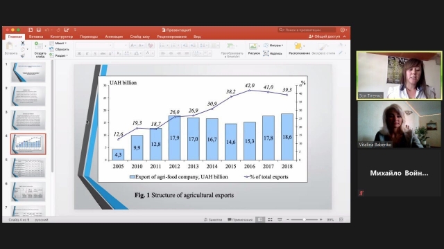 Надія Давиденко, завідувач кафедри фінансів, представила дослідження на тему «Integral assessment of the financial security level of agrarian corporations of Ukraine». Надія Миколаївна відмітила, що питання забезпечення та оцінки фінансової безпеки українських сільськогосподарських підприємств є досить актуальним в сучасних економічних умовах. Вона відмітила, що оскільки фінансова безпека суб’єктів господарювання є складовою фінансової безпеки держави тому вона потребує вирішення питань продовольчої, національної та екологічної безпеки, а тому повинна бути стратегічним напрямком політики країн.
