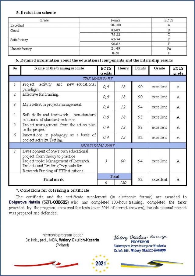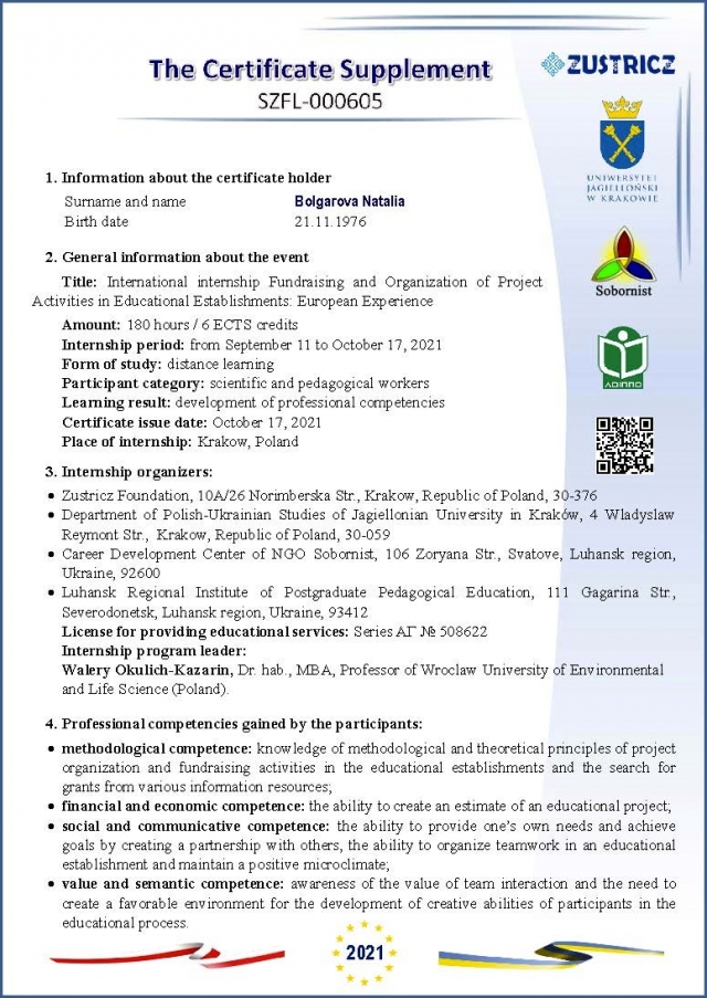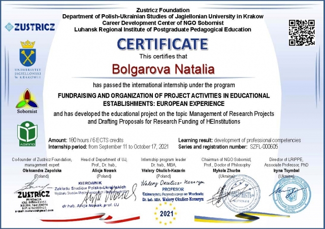 З 11 вересня по 17 жовтня 2021 року доцент кафедри економічної теорії Болгарова Наталя Костянтинівна успішно пройшла міжнародне стажування за програмою підвищення «International internship Fundraising and Organization of Project Activities in Educational Establishments: European Experience» Польща – Україна для педагогічних та науково-педагогічних працівників. Результатом стажування є навчання в обсязі 180 годин/6 кредитів ЕСТS, виконані завдання що були передбачені програмою, тематичне та підсумкове тестування, підготовлений власний освітній проєкт (випускна робота), що пройшов успішний публічний захист. Результати відображено у сертифікаті та додатку.