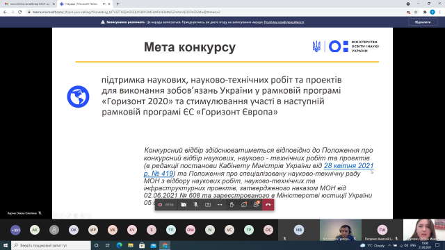 21 вересня 2021 року учасники навчально-наукової лабораторії біоекономіки НУБіП України взяли участь у вебінарі МОН щодо запуску конкурсного відбору проектів у рамках зовнішнього інструменту допомоги ЄС. Організаторами є команда Директорату науки та інновацій - самостійний структурний підрозділ апарату Міністерства освіти і науки України, який функціонує для виконання завдань, пов'язаних із забезпеченням формування та реалізації державної політики у сферах науки, наукової, науково-технічної діяльності, інноваційної діяльності в зазначених сферах, трансферу (передачі) технологій.