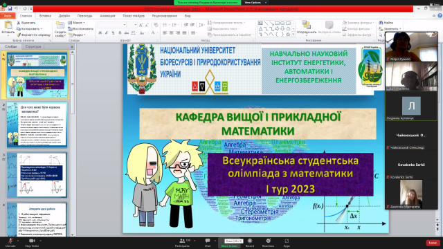 2 березня 2023 року на кафедрі вищої та прикладної математики НУБіП України в режимі онлайн відбувся І етап Всеукраїнської студентської олімпіади з нормативних дисциплін "Вища математика" і "Вища та прикладна математика".