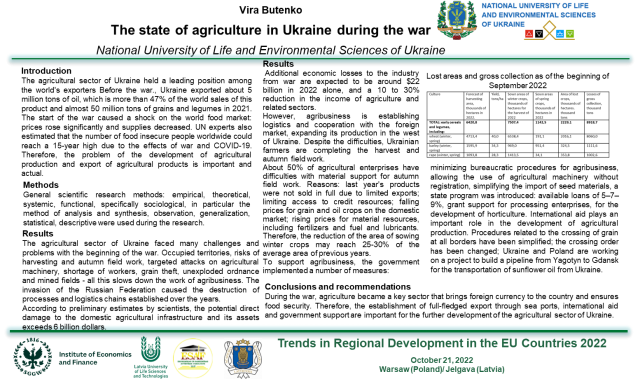 21 жовтня 2022 року відбулася 8-ма Міжнародна науково-практична конференція «TRENDS IN REGIONAL DEVELOPMENT IN THE EU COUNTRIES 2022», підготовлена Варшавським університетом наук про життя у співпраці із Латвійським університетом природничих наук і технологій та Латвійською академією сільськогосподарських і лісівничих наук, у якій у рамках наукового стажування взяла участь д.е.н., доцент кафедри економічної теорії Бутенко В.М.