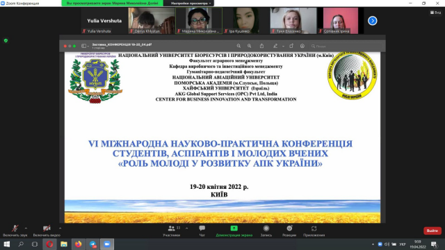VI Міжнародна науково-практична онлайн-конференція студентів, аспірантів і молодих вчених «Роль молоді у розвитку АПК України» відбулась 19 квітня 2022 року. Метою конференції визначено розкриття наукового потенціалу студентів, аспірантів і молодих учених, сприяння розвитку співробітництва у галузі аграрної науки, налагодження і поширення науково-освітніх, інформаційних зв’язків і взаємодії на національному рівні; формування культур міждисциплінарного спілкування, всебічного обговорення питань розвитку аграрної сфери; встановлення і розширення контактів між представниками освітянської та наукової спільноти; обмін науковими здобутками. Провідними темами дискусії стали: 1. Соціальні питання розвитку АПК. 2. Забезпечення світової продовольчої безпеки та роль України 3. Молоді науковці – соціально-психологічній науці