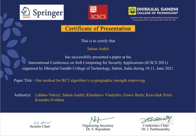 Доцент кафедри Андрій Сагун та колектив співаторів з числа НПП кафедри компютерних систем і мереж: зав.каф., професор Лахно Валерій, доцент кафедри Гусєв Борис прийняли участь в роботі Міжнародної конференції International Conference on Soft Computing for Security Applications ICSCS 2021 під егідою глобальної видавничої компанії Springer з доповіддю на тему: «One method for RC5 algorithm’s cryptographic strength improving».