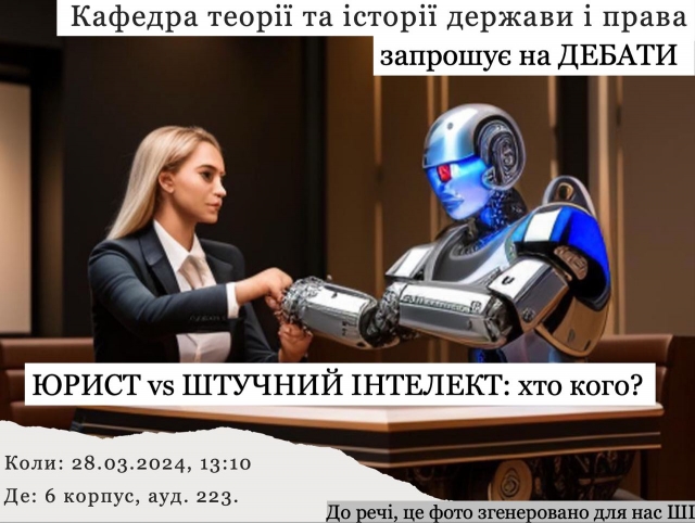 Увага! Кафедра ТІДП запрошує на студентські дебати "ЮРИСТ vs ШТУЧНИЙ ІНТЕЛЕКТ: хто кого?" 19 березня 2024 року 02:00 - 02:00