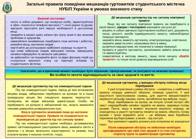 Під час поселення в гуртожиток студент повинен дотримуватись Загальних правил поведінки мешканців гуртожитків НУБіП України в умовах воєнного стану та користуватись засобами індивідуального захисту (захисна маска і антисептик для рук).