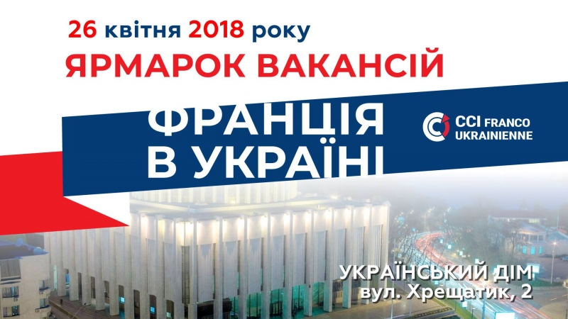 26 квітня 2018 року з 10.00 до 18.00 у Міжнародному конгрес-центрі «Український дім» (м.Київ, вул. Хрещатик, 2) відбудеться ярмарка вакансій «Франція в Україні». Студенти випускних курсів матимуть можливість поспілкуватися із роботодавцями та спеціалістами, подати резюме, пройти стажування та працевлаштуватися в міжнародних компаніях.