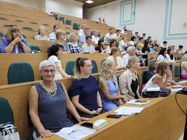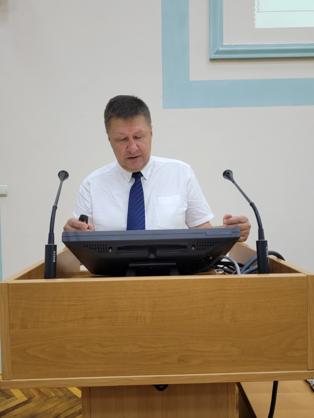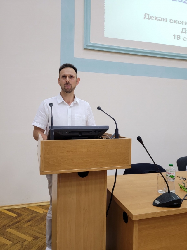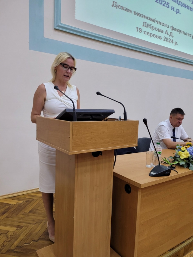 Підсумовуючи свій виступ Анатолій Діброва наголосив, незважаючи на нинішні надскладні умови воєнного стану колектив працює і має плани та завдання на 2024/2025 навчальний рік: ужити вичерпних заходів щодо збереження життя і здоров'я учасників освітнього-виховного процесу; забезпечити належну підготовку до проходження первинної акредитації освітніх програм «Міжнародна економіка», «Аналітичне і обліково-правове забезпечення бізнесу» та «Корпоративні фінанси» на ОС Бакалавр; розробити пропозиції до удосконалення проведення профорієнтаційної роботи; забезпечити постійне оновлення та актуалізацію навчально-методичного забезпечення дисциплін, в тому числі ЕНК, підручників, навчальних посібників; підвищити якість викладання дисциплін за рахунок удосконалення педагогічної майстерності та підвищення кваліфікації НПП; продовжувати практику проведення відкритих лекцій та практичних занять, поширювати педагогічний досвід кращих НПП; активізувати співпрацю з бізнесом, продовжити практику запрошення гостьових лекторів; забезпечити подальше зростання кількості публікацій НПП кафедр у виданнях, що входять до наукометричних баз даних SCOPUS, Web of Science та інших; підвищити науковий рівень фахового видання «Економіка та управління бізнесом» та організувати його включення до науково-метричної бази Scopus та WoS; забезпечити своєчасне та успішне проходження акредитації ОНП за спеціальностями 071, 072 та 076; звернути особливу увагу на пошук та підготовку проектних пропозицій для участі у Рамковій програмі з розвитку науки та інновацій «Горизонт Європа»; активізувати роботу НПП з підготовки міжкафедральних проєктів НДР для їх подання на конкурс до НФД України; продовжити практику залучення талановитих студентів, переможців олімпіад та конкурсів до участі у наукових гуртках, аспірантурі, виконання наукових тематик кафедр. У міжнародній діяльності: продовжити роботу зі збільшення кількості навчальних дисциплін, що викладаються іноземними мовами, а також чисельність НПП, що мають сертифікати про володіння іноземною мовою не нижче рівня В2; інтенсифікувати подання грантових заявок до міжнародних організацій та фондів за усіма пріоритетними напрямками наукових досліджень з урахуванням цілей та потреб післявоєнної відбудови економіки України та цілей сталого розвитку України на період до 2030 р.; поглиблювати та розширювати існуючі контакти із закордонними університетами-партнерами зі США, країн ЄС, зокрема Вишеградської асоціації університетів; проведення Міжнародних науково-практичних конференцій професорсько-викладацького складу, студентів, а також круглих столів з актуальних питань розвитку національної економіки; продовжити практику формування окремих англомовних груп для кожної спеціальності ОС «Бакалавр» і «Магістр» на факультеті та забезпечити викладання дисциплін англійською мовою; підвищити активність кафедр щодо пошуку та здобуття міжнародних грантів на проведення наукових досліджень у проектах програми ЄС з наукової мобільності, досліджень та інновацій «Horizont 2020»; забезпечити проходження стажування НПП та студентів в університетах-партнерах зі США, ЄС та інших країн; розвивати матеріально-технічну базу. В кінці виступу декан побажав всім успішного нового навчального року, щоб цей рік став переможним, і впев