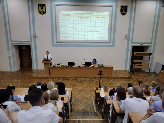 Голова вченої ради економічного факультету, д.е.н., професор Анатолій Діброва представив підсумки діяльності науково-педагогічного колективу економічного факультету за 2023/2024 навчальний рік та завдання на наступний навчальний рік, наголосивши на визначених завданнях розвитку НУБіП України поставлених на серпневій Вченій раді університету та зазначив, що ми живемо в умовах воєнного стану, що змінило багато чого в нашому житті, в освітній діяльності, але незважаючи ні нащо цей рік повітряних тривог, блекаутів, відсутності інтернету ми вистояли і в цілому можна говорити про позитивний підйом. Очільник факультету зосередив увагу на попередніх результатах вступу. Він висвітив інформацію про кількість заяв на бакалаврат в Україні у розрізі спеціальностей 05 і 07 галузей знань, що показує значний вплив кон’юнктури ринку на подачу заяв. Доповідач зосередив увагу на інформації про хід надходження заяв від вступників денної форми навчання на ОС Бакалавр в розрізі освітніх програм, форм навчання, пріоритетами. Найбільша кількість заяв надійшла на освітні програми: «Підприємництво, торгівля та біржова діяльність», «Економіка підприємства», «Фінанси і кредит». Прийом на основі молодшого спеціаліста в цьому році здійснювався за широким конкурсом, серед них найбільше заяв подано на освітню програму «Фінанси і кредит». Всього на економічний факультет подано на базі повної загальної середньої освіти і молодшого спеціаліста 942 заяви. Щодо попередніх результатів, то на програми підготовки бакалаврів прийнято 241 вступники в т.ч. на базі школи – 211, на базі ОКР «Молодший спеціаліст» («Молодший фаховий бакалавр») – 30 осіб. Однак не зважаючи на складну ситуацію повʼязану з воєнним станом, впливом кон’юнктури ринку на подачу заяв, факультет протягом трьох років зберіг контингент студентів.Декан ознайомив присутніх з графіком навчального процесу на 1 семестр 2024-2025 н.р. та розкладом початку та закінчення навчальних занять.