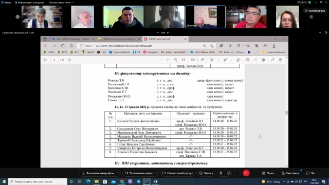 Секретар Людмила Тітова наголосила, що сформований звітний пакет (атестаційний лист, витяг з протоколу засідання кафедри, вченої ради факультету конструювання та дизайну та звіт аспіранта за атестаційний період) атестаційних документів аспіранти мають подати на засідання вченої ради факультету констуювання та дизайну на 17 травня 2022 року, а до відділу аспірантури на 20 травня 2022 року.