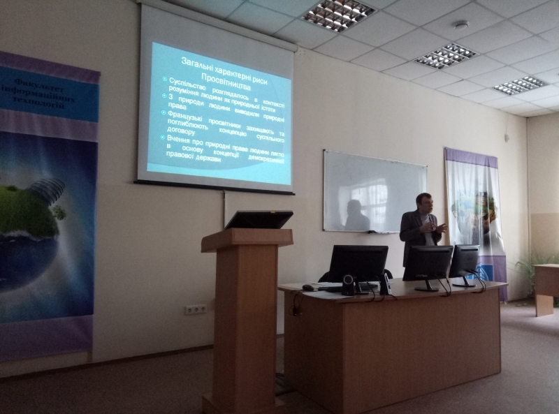22 березня 2019 р. на 1 парі в аудиторії 230 навчального корпусу № 15 відбулася відкрита лекція кандидата філософських наук, доцента кафедри філософії Горбатюка Тараса Віталійовича з дисципліни «Філософія» для студентів 2 курсу факультету інформаційних технологій на тему «Філософія Просвітництва ХVIII cт.». На лекції були присутні: завідувач кафедри філософії канд. філос. н., доцент Савицька І.М. , а також викладачі кафедри д. філос. н., проф. Сторожук С.В., канд. філос. н., доцент Культенко В.П., канд. філос. н., доцент Данилова Т.В., канд. філос. н., ст. викладач Чорноморденко Д.І.