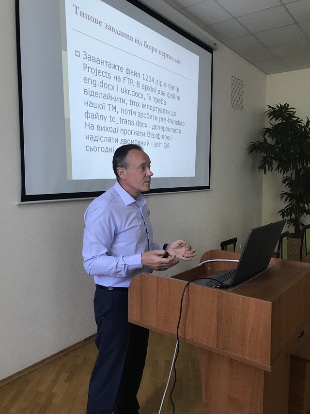 Розпочав лекцію Ростислав Тарасенко із пропозиції уявно спроектувати кожному студенту свою власну навчальну траєкторію з метою усвідомлення цілей, які вони мають досягнути, щоб стати успішними, конкурентоспроможними фахівцями у майбутньому. Акцент при цьому мав бути зроблений на рівень їхнього володіння сучасними інформаційними технологіями. Щоб допомогти студентам впоратися із цим, Ростислав Олександрович запропонував разом проаналізувати вимоги різних перекладацьких структур до претендентів на посади перекладачів в аспекті володіння різними видами загального і спеціалізованого програмного забезпечення.