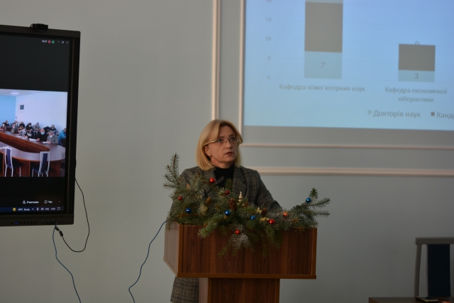 Декан відмітила, що у 2021 році захистили дисертації та отримали науковий ступінь доктора філософії 3 НПП – Костенко І.І., Корольчук В.І., Саяпіна Т.П., та 2 НПП отримали ступінь кандидата наук – Пархоменко О.В. та Саяпін С.П. Рейтинг НПП факультету у 2021 році склав 1,78, що на 0,11 вище за аналогічний показник минулого року (1,67 – у 2020). Найбільш високий рейтинг мають НПП кафедри економічної кібернетики – 2,08, найнижчий – кафедри комп’ютерних наук – 1,35. Порівняно з 2020 роком всі кафедри підвищили рейтингові показники. На факультеті акредитовано програму підготовки PhD спеціальністю 122 «Комп’ютерні науки» освітньо наукової програми «Інформаційні технології» (протокол НАЗЯВО від 14 грудня 2021 №19)