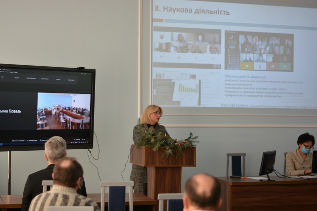 Декан зазначила: 36 НПП мають публікації в БД Скопус, Web of Science. Сумарний індекс Гірша у БД Скопус дорівнює 108, а загальна кількість публікацій 1366. Загальна кількість опублікованих статей у 2021 році, які входять до наукометричних баз даних – 72, у т.ч. штатними співробітниками: які входять до наукометричних баз даних Scopus – 42 (17,88 др.арк.), Web of Science – 6 (5,43 др.арк.), у т.ч. штатних співробітників: Scopus – 27, Web of Science – 9, які входять до інших наукометричних баз – 13 (8,9 др.арк.), у т.ч. штатних співробітників – 13; опублікованих в міжнародних виданнях (окрім вузівських і, які не рецензуються жодною наукометричною базою) – 4 (4,23 др.арк), у т.ч. штатними співробітниками –4; опублікованих у вузівських (фахових) виданнях – 17 (7,7 др.арк.), у т.ч. штатними співробітниками – 9 . У 2021 році співробітники, аспіранти, студенти факультету інформаційних технологій брали активну участь у ряді наукових заходів, як в Україні, так і за її межами. Кількість штатних НПП факультету інформаційних технологій, що брали участь у роботі конференцій, семінарів, симпозіумів за кордоном – 8, в Україні – 9.
