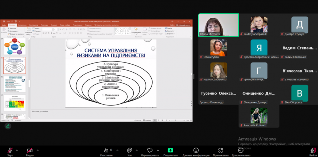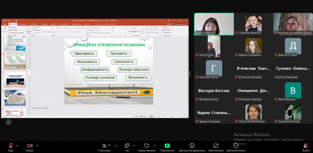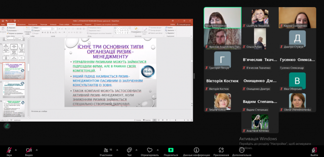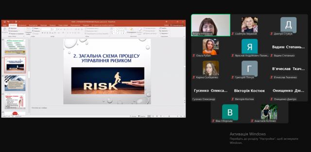 Лекція розпочалася з визначення її мети та змісту. Лекторка охарактеризувала різні підходи до визначення поняття «управління ризиками», в тому числі в міжнародних стандартах і нормативно-законодавчих актах України, і обґрунтувала важливість управління ризиками в підприємницькій діяльності. Окрім цього, було розкрито функції, які виконує ризик-менеджмент, основні його типи, переваги і принципи, а в рамках представлення загальної схеми процесу управління ризиком лекторка акцентувала увагу на основних його етапах. Особливо увага студентів була зосереджена на основних типах організації ризик-менеджменту, стратегіях підприємств із управління ризиками, практичних прикладах керування ризиками і міжнародних стандартах, які регламентують діяльність у даній сфері.