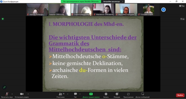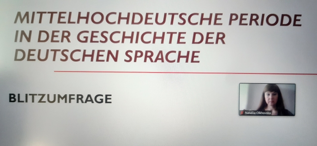 27 вересня 2023 року на 3 парі відбулося відкрите лекційне заняття доцента кафедри іноземної філології і перекладу Наталії Ольховської з дисципліни “Історія основної іноземної мови (німецька)” для студентів 3 курсу спеціальності 035.043 Філологія (німецька, переклад включно) на тему „Mittelhochdeutsche Periode in der Geschichte der deutschen Sprache“.