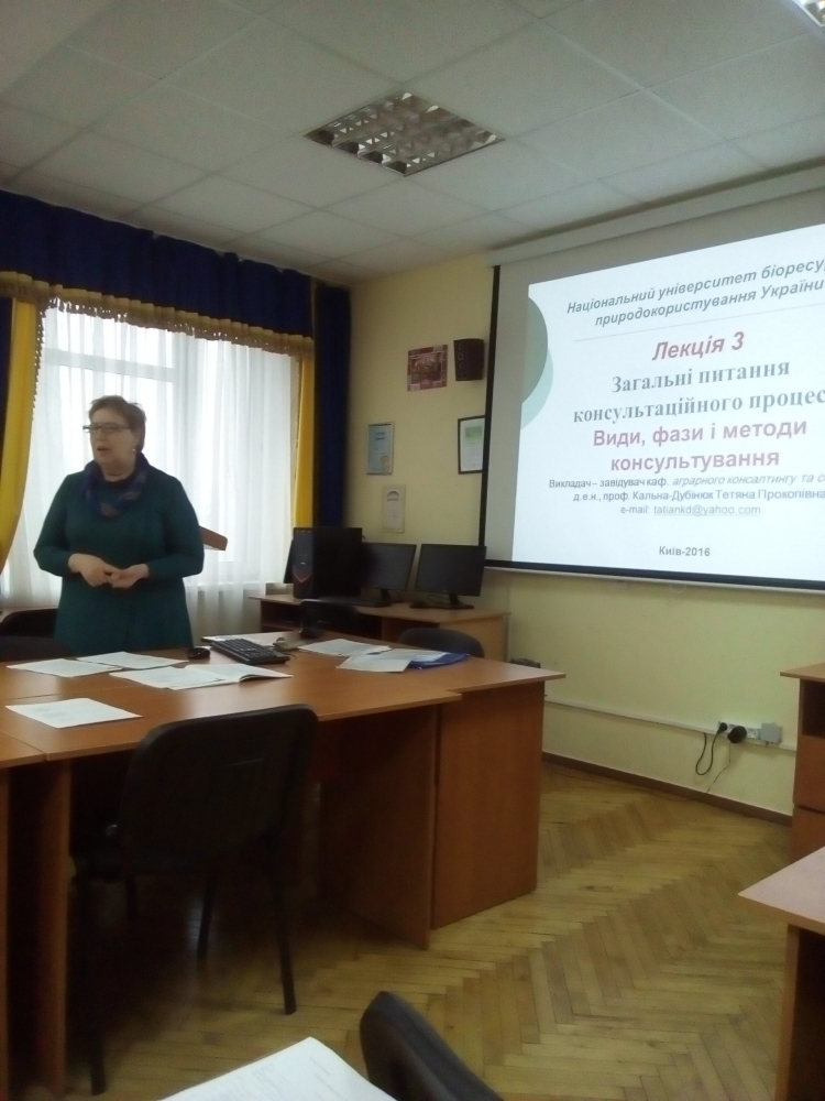 7 березня 2017 року проведено відкрите лекційне заняття професора, д.е.н., завідувача кафедри аграрного консалтингу та сервісу Тетяни Прокопівни Кальної-Дубінюк на тему: «Види, фази і методи консультування». Слухачами були магістри 1 року навчання спеціальності «Дорадництво» і «Управління інноваційною діяльністю».