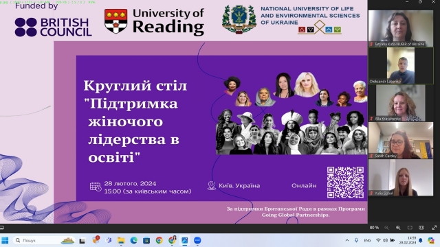 Вероніка Мішель Бачелет Херія 28 лютого 2024 року відбувся круглий стіл «Підтримка жіночого лідерства в освіті», в рамках спільного проєкту, що реалізується Національним університетом біоресурсів і природокористування України та Університетом Редінг (Велика Британія).