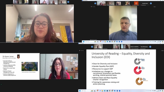 Юлія Соболь, менеджерка освітніх проектів Британської Ради в Україні підкреслила, що співпраця НУБіП України та Університету Редінг має на меті стимулювати нові підходи для розвитку освіти в Україні. Юлія Соболь також звернула увагу, що гендерна рівність вкрай важлива і жінки мають бути оснащені інструментами аби зайняти освітні лідерські позиції. Карен Джонс, старший науковий співробітник АВО, директорка програми EdD, Інститут освіти Університету Редінг познайомила учасниць з системою підтримки жінок в університеті Редінг та висловила побажання щодо спільної співпраці в подальшому.