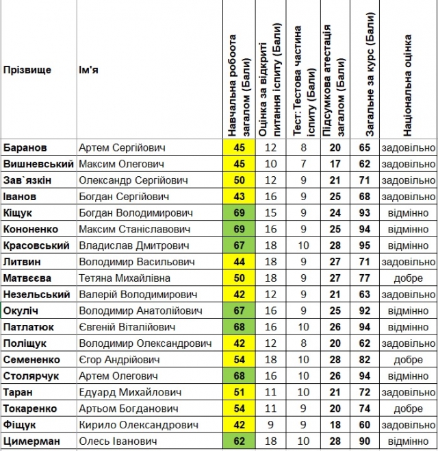Під час здачі іспиту більшість студентів показали позитивні результати та отримали такі оцінки: