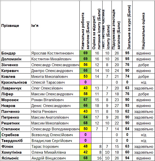 Слід відзначити високу активність студентів під час дистанційного навчання на навчальному порталі Е-льорн. Майже всі отримали допуск за результатми виконання навчального навантаження, виконання лабораторних та сомостійної роботи. Нажаль є такі, що не справились з поставленими задачами (Олексій Красильніков, Всеволод Стребков, Владислав Твердохліб) та були не допущені до складання іспиту за першими відомостями, їх чекає кропітлива робота з погашення боршів та допуску на екзамен за другими відомостями.