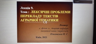 У вівторок 9 березня о 14.00 відбулася відкрита онлайн-лекція доцента кафедри іноземної філології і перекладу гуманітарно-педагогічного факультету НУБіП України Ольховської Н.С для студентів 4 курсу спеціальності «Філологія. Германські мови та літератури, перша – німецька)» з Аспектного перекладу аграрної літератури на тему: «Лексичні проблеми перекладу текстів аграрної тематики».