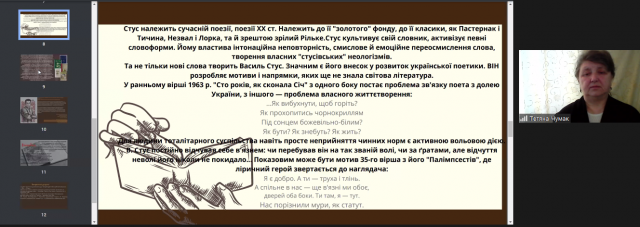 Лекторка глибоко зуміла розкрити сутність кожного з пунктів плану, якісно пояснила інформацію, проаналізувавши та навівши приклади поезії П.Мовчана, В.Затуливітра, Л.Талалая, І.Малковича, І.Римарука, В.Герасим’юка, В.Голобородька.