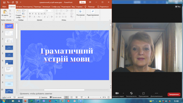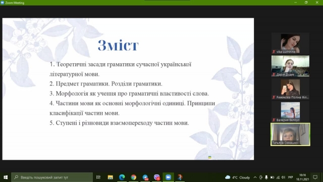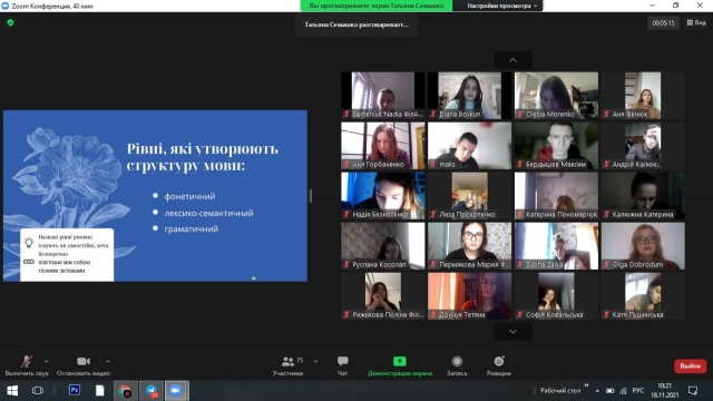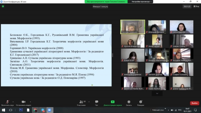 18 листопада 2021 р. відбулась відкрита онлайн-лекція доктора філологічних наук, професора кафедри журналістики та мовної комунікації Семашко Т.Ф. Лекцію з навчальної дисципліни «Сучасна українська мова» на тему «Граматичний устрій мови» було прочитано студентам 1-го курсу ОС «Бакалавр» спеціальності «Філологія» гуманітарно-педагогічного факультету.