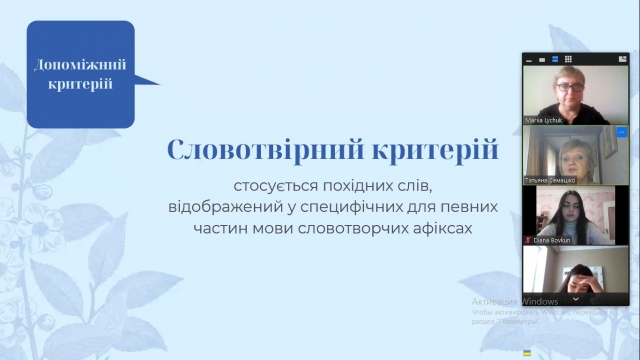 Упродовж заняття лектором були висвітлені питання щодо теоретичних засад граматики сучасної української літературної мови, предмет граматики, розділи граматики; питання морфології як учення про граматичні властивості слова та частини мови як основні морфологічні одиниці, принципи класифікації частин мови, ступені та різновиди взаємопереходу частин мови.