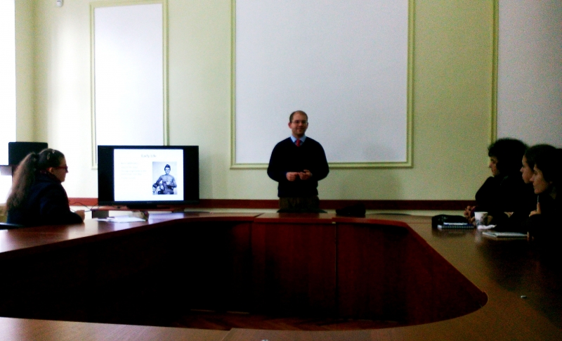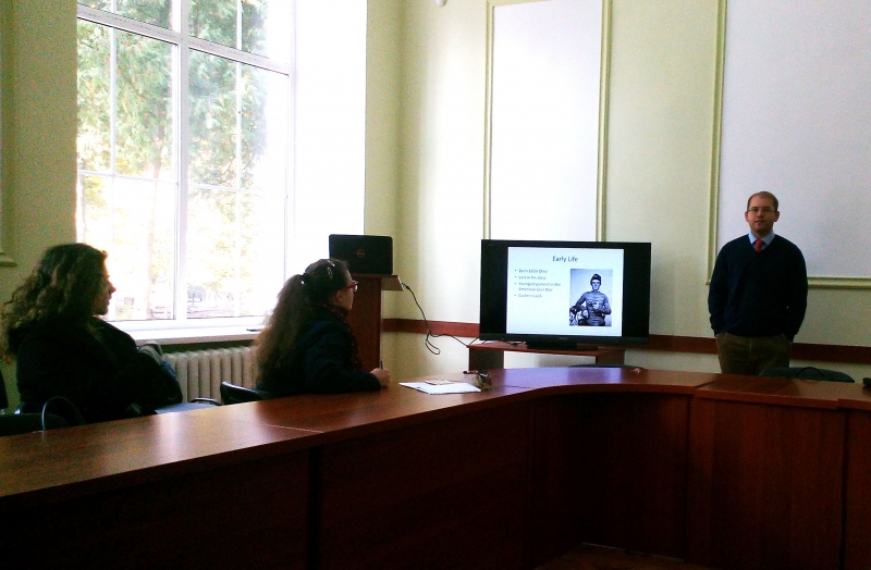 Після короткого знайомства з аудиторією професор В. Фляйшман, який спеціалізується на вивченні історії американських кордонів та пов’язаних з ними питань, попровадив присутніх у захопливу віртуальну подорож Америкою часів боротьби за свободу і демократію. Значну частину своєї уваги доповідач приділив неординарній постаті підполковника Джорджа Армстронга Кастера (1839-1876) та його ролі у найвизначніших битвах, перемогах і поразках того періоду, що викликало значний інтерес у присутніх.