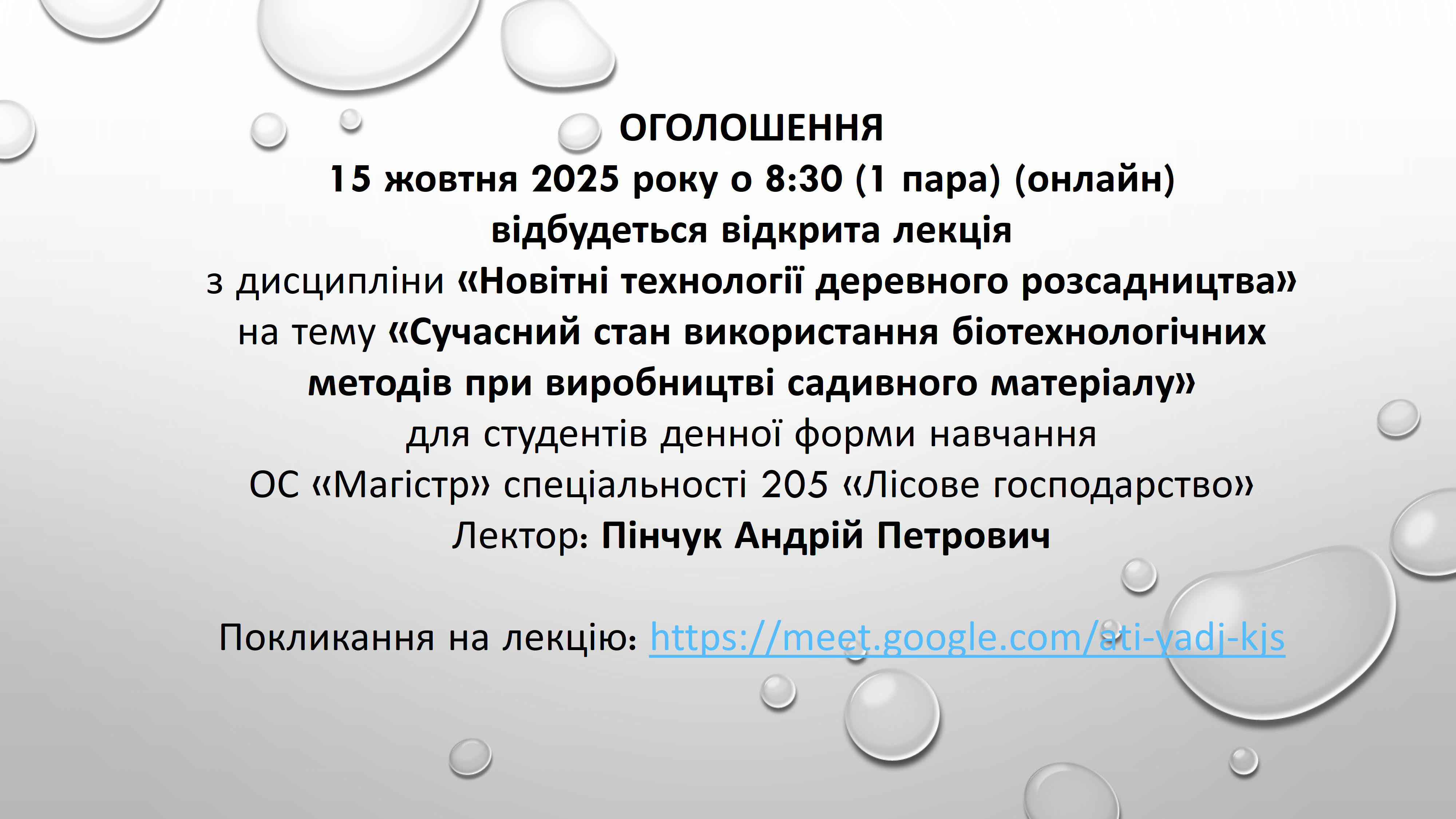 Відкрита лекція з дисципліни «Новітні технології деревного розсадництва» 15 жовтня 2025 року 08:30 - 09:50 Формат: Онлайн