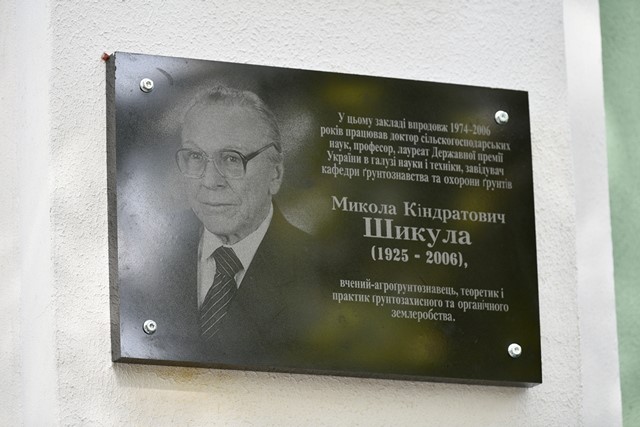 Сьогодні, 24 вересня 2020 р. біля 2 навчального корпусу НУБіП відбулося урочисте відкриття меморіальної дошки видатному українському вченому– ґрунтознавцю – Миколі Кіндратовичу Шикулі. Він уславив своєю діяльністю не лише нашу alma-mater, а став визнаний в усьому світі – був членом Європейського товариства з обробітку ґрунтів, Європейської асоціації із захисту ґрунтів від ерозії, експертом ФАО, керівником Міжнародної науково-технічної програми із захисту ґрунтів від ерозії, читав лекції із ґрунтознавства у Болгарії, США, Угорщині, Чехословаччині, Данії, Швеції і Польщі.