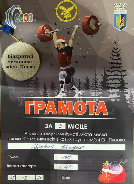 2 місце в категорії +109 кг зайняв Богдан Горовий з результатом: ривок 75 кг, поштовх-115 кг. Вчиться Богдан на МТФ 2 курс, група АІ 2002.