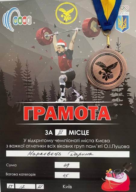 3 місце у ваговій категорії 45 кг заняла Марковець Дарина з результатом: ривок - 19 кг, поштовх -30 кг. Вчиться Дарина на гуманітарно-педагогічному факультеті на спеціальності 017 фізичне виховання і спорт, 2 курс, 2 група.