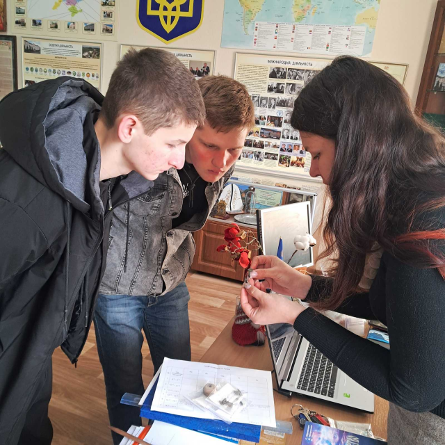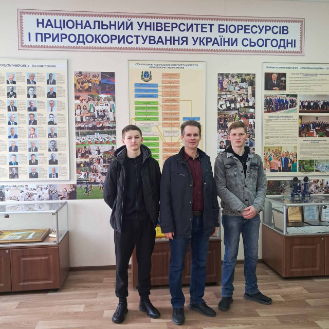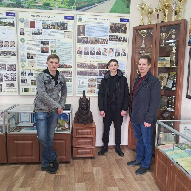 Прийшовши у музей хвилин на 15 раніше призначеного часу, ми з двома студентами Андрієм Баглаєм і Олександром Блажкуно були приємно вражені гостинним прийомом директора музею Поливач Марією Анатоліївною. Вона запропонувала сфотографувати нас на фоні цікавих експозицій музею.