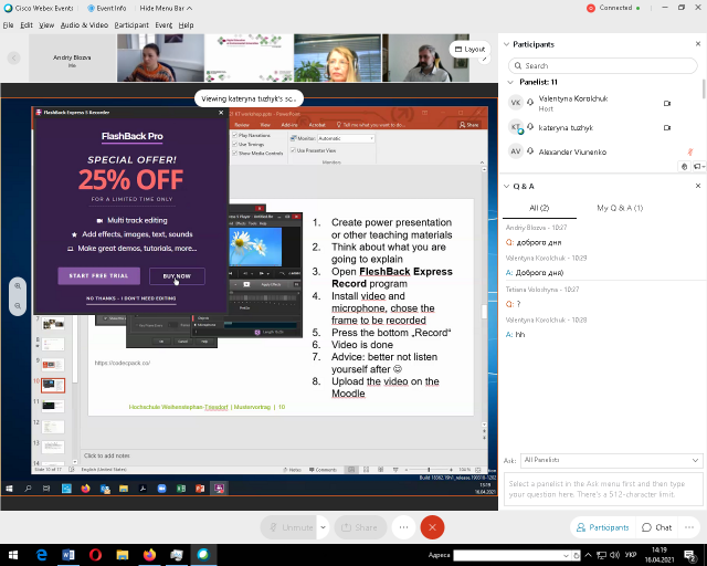 Міжнародний воркшоп із застосування сучасних інструментів онлайн-навчання модерували представники двох університетів: НУБІП Украіїни та університету прикладних наук Weihenstephan-Triesdorf (Німеччина). Катерина Тужик презентувала досвід створення освітніх відеоресурсів німецького університету. Дослідниця продемонструвала ресурси створені у Panopto та пояснила переваги використання. До останніх належать високий рівень безпеки, інтегрованість з Moodle. Приклади використання H5P для створення цифрових інноваційних ресурсів презентував керівник центру дистанційних технологій навчання НУБіП України Максим Мокрієв.