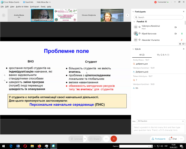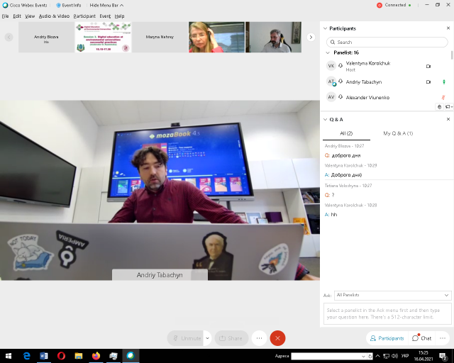 Приклади застосування цифрових інструментів та сервісів підтримки освітньої та наукової діяльності представили: Марія Шишкіна (Інститут інформаційних технологій і засобів навчання НАПН України), Денис Міхєєнко (Донбаська державна машинобудівна академія), Марина Негрей (НУБіП України) та Андрій Табачин (компанія EdPro).