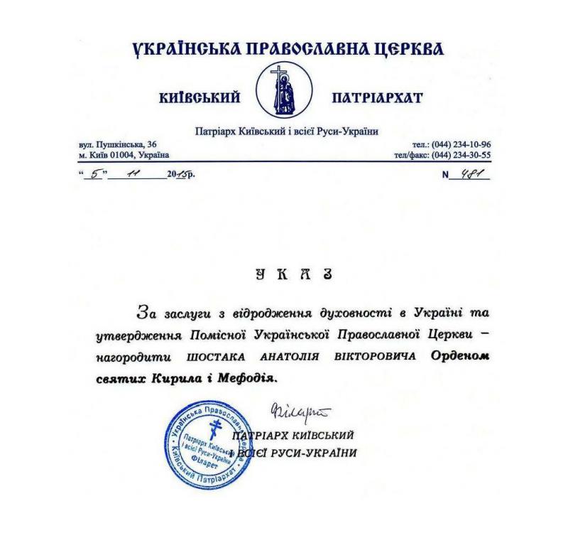 В Указі сказано: «За заслуги з відродження духовності в Україні та утвердження Помісної Української Православної церкви – нагородити Шостака Анатолія Вікторовича Орденом святих Кирила і Мефодія».