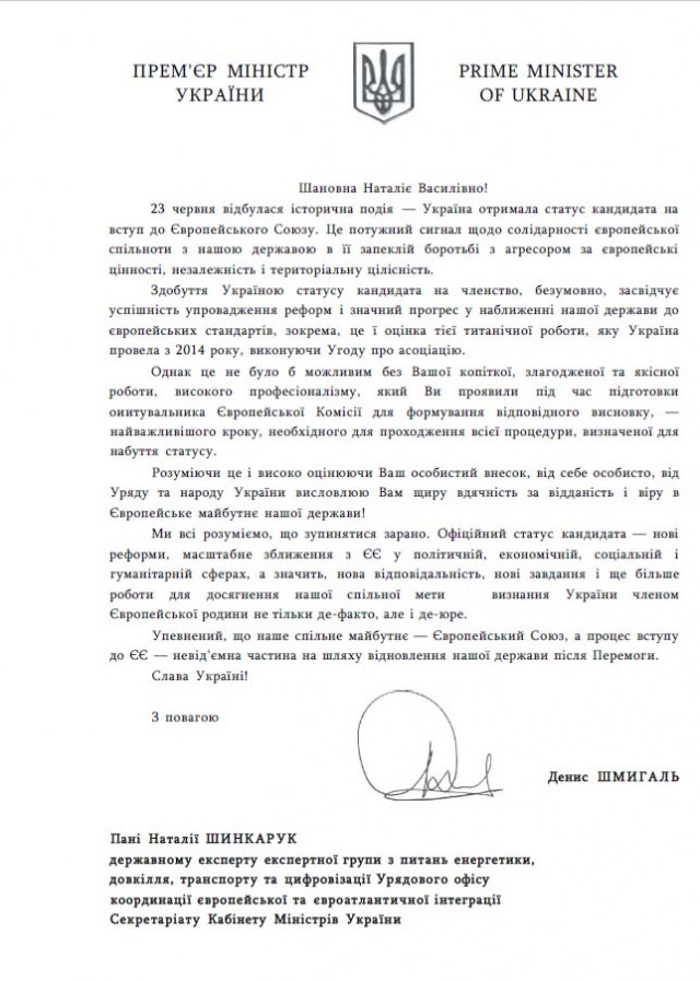 Наша колега проявила високий професіоналізм під час підготовки опитувальника Європейської Комісії для формування відповідного висновку. Її внесок, як і всіх, хто працював з 2014 року над впровадженням реформ і наближенні європейських стандартів, увінчався отриманням Україною статусу кандидата на вступ до Європейського Союзу.