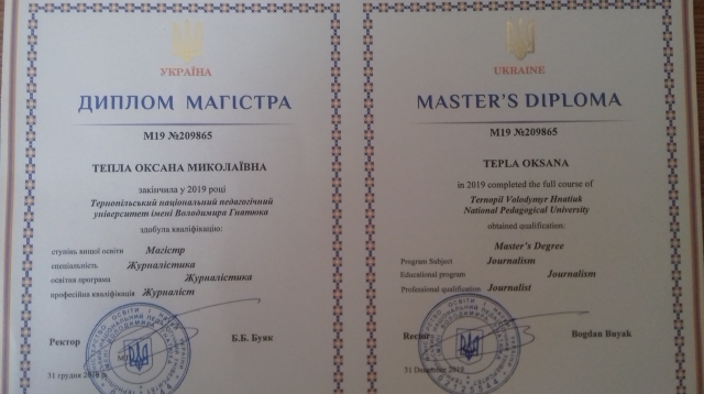 Доцент кафедри журналістики та мовної комунікації Тепла Оксана Миколаївна 2019 року успішно закінчила навчання у Тернопільському національному педагогічному університеті імені Володимира Гнатюка за спеціальністю 061 Журналістика для другого (магістерського) рівня і здобула кваліфікацію журналіста. Наші вітання!!!