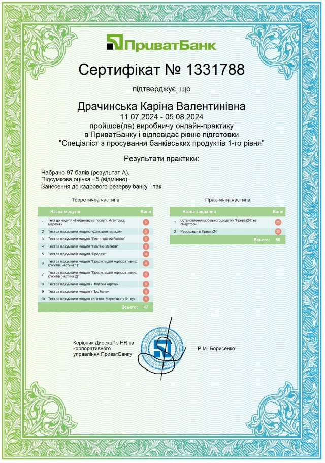 Вітаємо КАРІНУ ДРАЧИНСЬКУ студентку 3-го курсу 1-ї групи спеціальності Економіка з отриманням СЕРТИФІКАТУ за успішне проходження виробничої практики в ПриватБанку