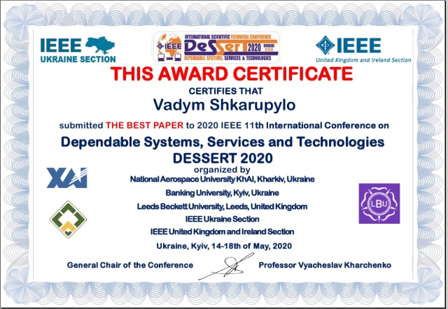 Доцент кафедри комп'ютерних систем ві мереж, кандидат технічних наук Вадим Шкарупило був нагороджений сертифікатом за подання кращої англомовної наукової праці в номінації «THE BEST PAPER» на конференцію «2020 IEEE 11th International Conference on Dependable Systems, Services and Technologies, DESSERT 2020» (http://dessert.ieee.org.ua/dessert-2020/), що відбулася 14-18 травня 2020 р., м. Київ, Україна.