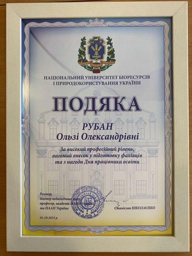 Вітаємо Ольгу Рубан з отриманням подяки від ректора НУБіП України