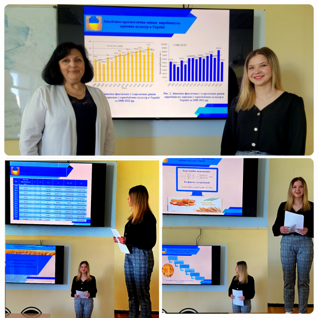 Наукова робота Рухаленко Анастасії «Аналітико-прогностична оцінка виробництва зернових культур в Україні» присвячена теоретико – методичним та прикладним питанням економіко-статистичного аналізу виробництва зернових культур в Україні та його прогностичної оцінки. Оцінено сучасний стан, тенденції та перспективи розвитку зерновиробництва, визначено його ступінь залежності від ендогенних та екзогенних чинників, здійснено прогностичні розрахунки зерновиробництва на основі побудованих адекватних трендових моделей.