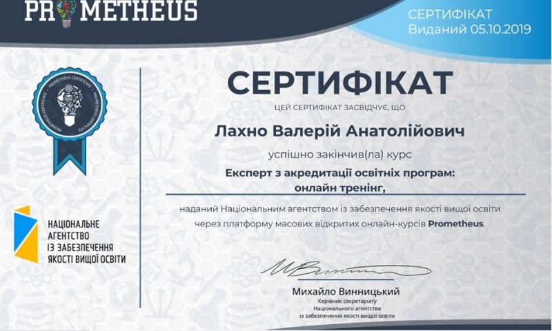 Вітаємо професора Валерія Лахна з отриманням Сертифікату експерта з акредитації 7 жовтня 2019 року 14:42 - 14:42
