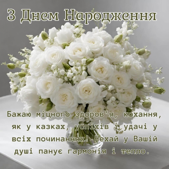 Від щирого серця бажаємо міцного здоров'я, щастя, сімейного затишку, здійснення самих заповітних мрій, творчих досягнень та позитивних емоцій, душевного спокою, сімейного затишку, невичерпної енергії, креативу, оптимізму, чарівної посмішки, вогників в очах, душевного тепла, мирного неба, незмінної віри у краще майбутнє та всіх земних благ!!! Нехай щастя розквітає в кожному куточку вашого дому, а серце завжди наповнюється теплом і гармонією. Миру і добра Вам!!!