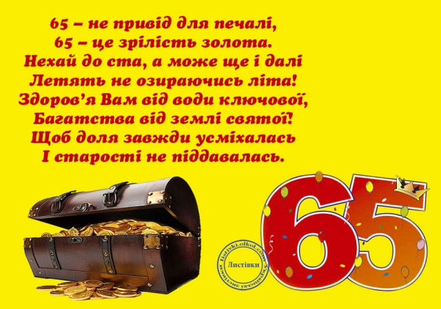 У свої 65 Ви прекрасні: мудрі, розумні, прекрасні і добрі. Нехай життя буде до Вас щедрим, нехай удача ходить поруч, а щастя буде Вашим супутником! Бажаємо, щоб джерела щастя і тепла невтомно били ключем, наповнюючи Ваше життя простими радощами і приємними спогадами!