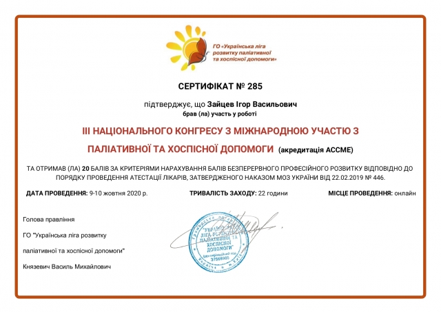 Вітаємо здобувача вищої освіти другого (магістерського) рівня освітньо-професійної програми "Соціально-психологічна реабілітація" Ігоря Зайцева з одержанням сертифікату ІІІ НАЦІОНАЛЬНОГО КОНГРЕСУ З МІЖНАРОДНОЮ УЧАСТЮ З ПАЛІАТИВНОЇ ТА ХОСПІСНОЇ ДОПОМОГИ!