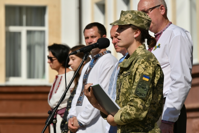 Присутніх також вітала відмінниця навчання, курсантка кафедри військової підготовки Анна Сердюк, яка згадала полеглих воїнів і запропонувала вшанувати їх хвилиною мовчання. Також до шановної громади звернулася голова СО гуманітарно-педагогічного факультету Аліна Майборода.