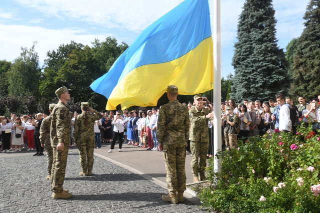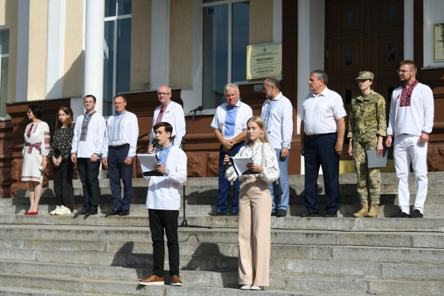 На церемонію підняття Державного прапора України зібралися члени вченої ради, ректорат, представники усіх факультетів та ННІ, служб та відділів, студенти, а підняли прапор під звуки Гімну України, який виконували усім колективом, курсанти кафедри військової підготовки.