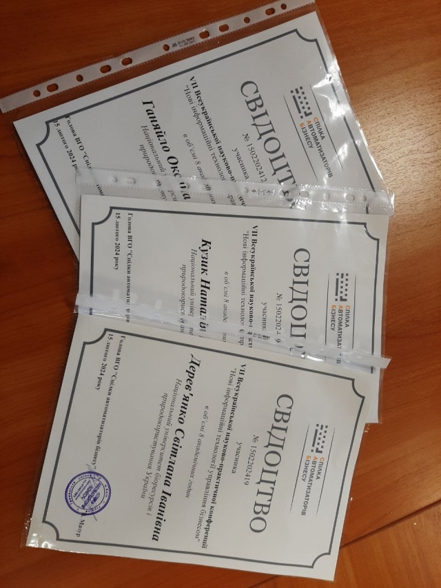 15 лютого 2024 року викладачі кафедри обліку та оподаткування економічного факультету – в.о.завідувача кафедри, к.е.н., доц. Володимир Литвиненко, к.е.н., доц. Олена Боярова, Оксана Ганяйло, Тамара Гуренко, Світлана Дерев’янко, Наталія Кузик, Людмила Мельянкова, Катерина Шевчук, к.е.н., ст.викладач Любов Миськів взяли участь у VІІ Всеукраїнській науково-практичній конференції «Нові інформаційні технології управління бізнесом», організованій Спілкою автоматизаторів бізнесу - організацією, створеною для підтримки та сприяння розумінню ролі автоматизації в сучасному бізнесі, обміну досвідом, навичками та інноваційними підходами. Захід відбувся у форматі зустрічі очно, в актовій залі головного (червоного) корпусу Київського національного університету імені Тараса Шевченка та онлайн, з можливість переглянути трансляцію конференції за посиланням, яке отримали зареєстровані учасники на свої електронні адреси.